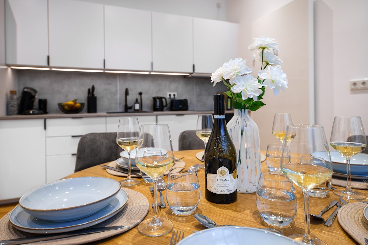 En spesiell atmosfære venter på deg i et stilig hus med en fjern utsikt. Ved siden av soverommene er det et fellesrom, et fullt utstyrt kjøkken og et romslig bad med badekar og dobbel vask for deg. Leiligheten passer for par, forretningsreisende og familier (med barn). Du har en egen inngang til leiligheten. På forespørsel kan en vaskemaskin i kjelleren brukes av gjestene.