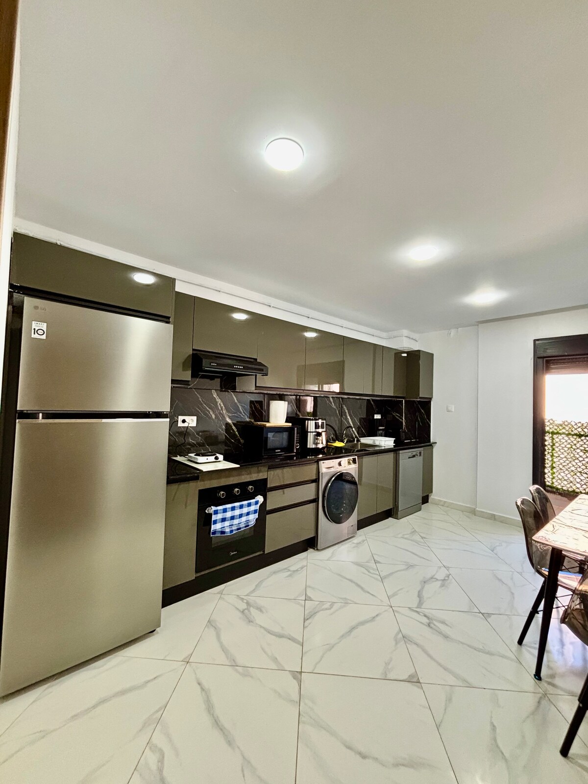 Appartement neuf et lumineux en résidence sécurisée à Belgaïd, Oran. Idéal pour famille ou amis, jusqu’à 5 personnes. Situé à proximité de Cool Park. 2 chambres, salon avec TV murale, cuisine équipée, climatisation, lave-linge. Salle de bain + WC séparés. Petit balcon. Au 2e étage avec ascenseur. • 5 min de l’université Belgaïd • 10 min de la plage Ain Franine • 15 min d’Akid Lotfi • 20 min de Senia Center (en voiture) Accueil chaleureux garanti, nos voyageurs en parlent tous