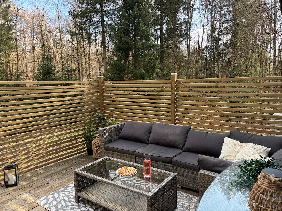 Koselig hytte like utenfor Höör hvor du har full tilgang til hele stedet og hvor det blant annet er en komfyr, peis ute, stor treplatting og en romslig hage med skog rett bak. Stedet ligger i en liten hyttelandsby nær innsjøen Quvesarum. Rundt hyttene er du omgitt av skogen, og med en 10 minutters spasertur gjennom skogen kan du komme ned til en innsjø med grill og badeplass. MERK: boblebadet er ute av drift. Dette er ikke et sted å ha fest eller spille musikk utendørs, siden det er i et boligområde.