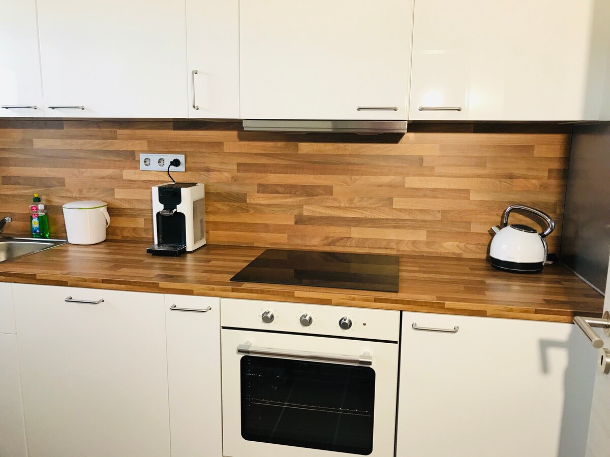 Velkommen til min 95 kvadratmeter store, nydelig lyse feriebolig! Jeg er alltid glad for å ønske hyggelige gjester velkommen! I hagen er det rikelig med plass til å slappe av, spise frokost, leke med barna eller nyte hyggelige grillkvelder. I de kjøligere månedene kan du kose deg foran den knitrende peisen. Leiligheten tilbyr alt du kan ønske deg, fra å jobbe hjemmefra ved skrivebordet til å skjemme deg selv bort i regnskogsdusjen eller i badekaret :)