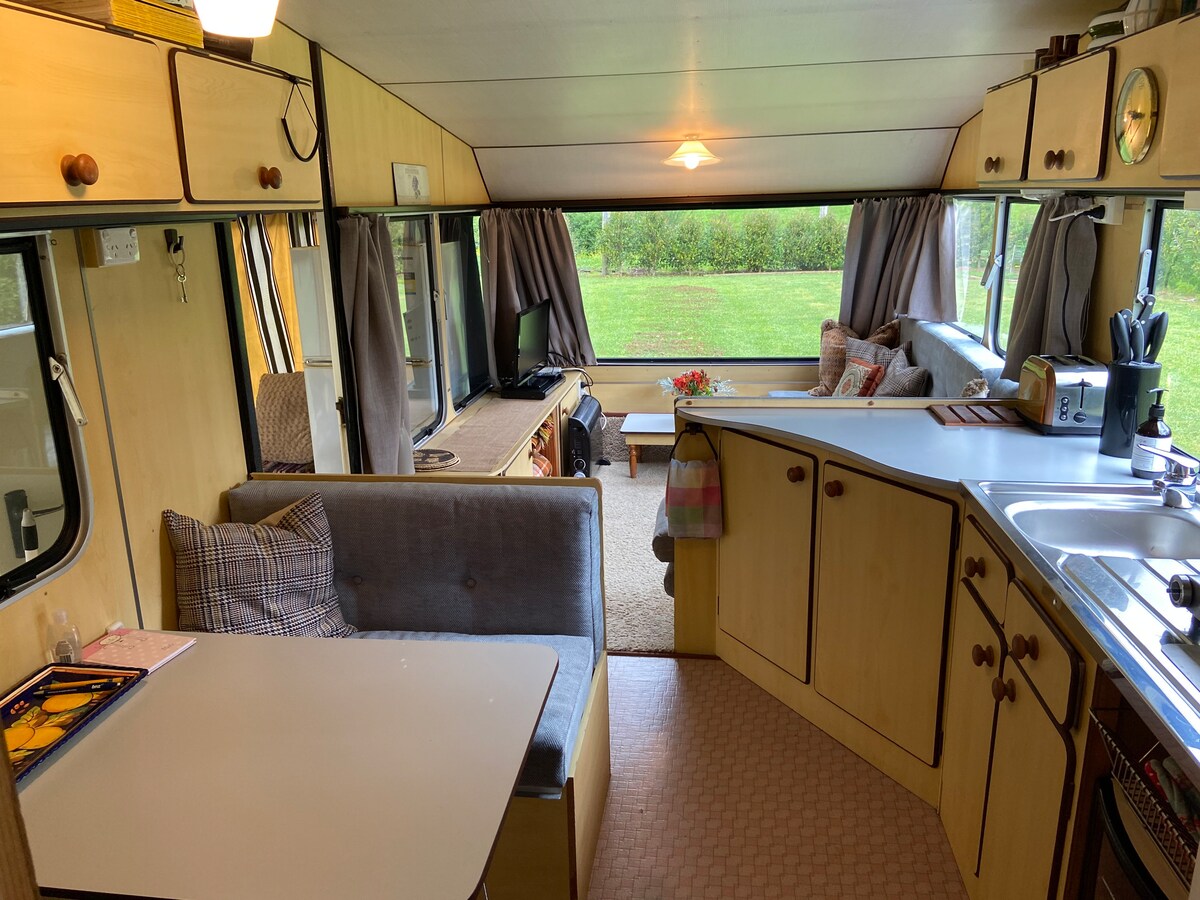 Plassert i vår private, stille, solfylte hage er Elsie kitch campingvogn og anneks. Vedlagt anneks dobler plassen, inkluderer toalett, dusj, alfresco stue, kjøleskap/fryser, konveksjon mikrobølgeovn, induksjon tvillingkoketopp, vask, slankere og barstoler. Privat tilgang og trygg parkering utenfor gaten. Passer sesongarbeidere, reisende eller BTI-studenter. Lengre opphold er velkomne. Rolige, respektfulle gjester, takk, kaffe eller en drink på fremste dekk for å nyte utsikten som er velkommen. Søt tabby-katt her