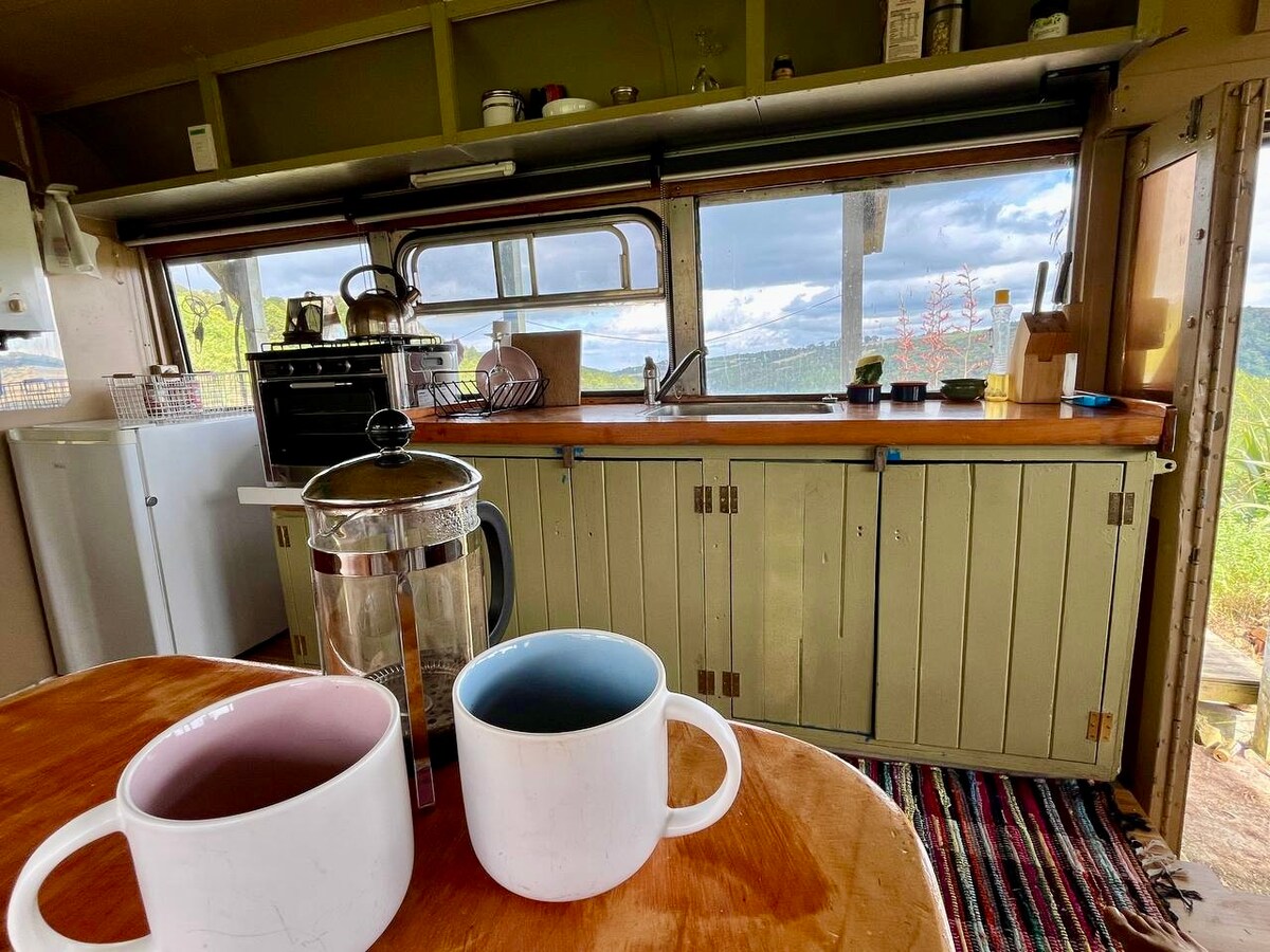 Er du interessert i en opplevelse med husbuss? Vi har en vakker, gammel Bedford Classic som heter Lady, og ved siden av står Tramp, en moderne bobil for ekstra personer hvis dere bestiller som en gruppe. Fra det øyeblikket du ankommer, kommer du til å bli fortryllet av den naturlige bushen, de lokale badeplassene, fuglesangen og eiendommens mana. Kom, koble av og finn tilbake til naturen – det koselige overnattingsstedet og det omkringliggende busklandet sikrer privatliv. Campingkjøkken og fellesområde, inne- og uteområde med hengekøye og andre kroker hvor du kan strekke deg ut og slappe av.