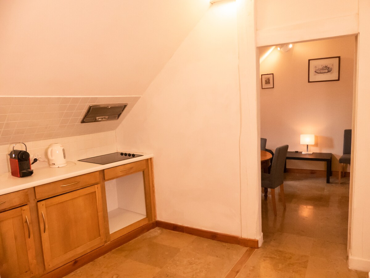 Nyt en eller flere netter i et middelalderslott i Bourgogne! Øverst i pullbridge-bygningen er det et uavhengig overnattingssted med to soverom, et kjøkken med kokeplate, kjøleskap og fryser, N espressomaskin, vask med to søppelbøtter og mikrobølgeovn. Bad med dusj og toalett. Frokost, servert på et rom på slottet, er inkludert i den oppførte prisen. Romagna er en tidligere kommander som ble grunnlagt av tempelet rundt 1140.
