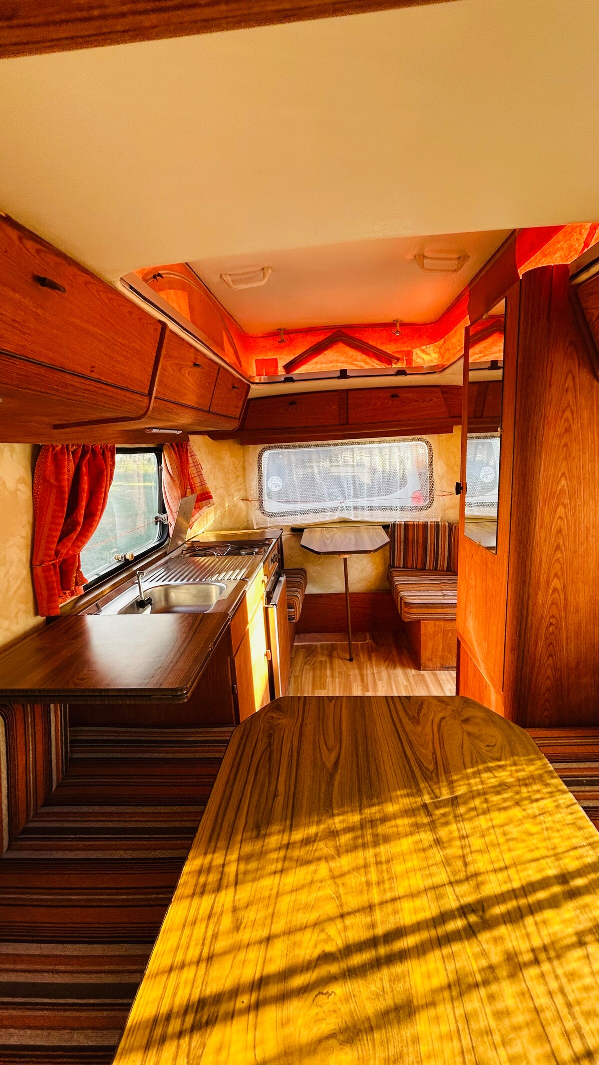 Natt (er) i vintage campingvogn.