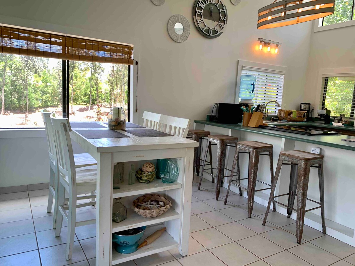~ Friluftsliv på en frodig mangogård ~ 1,6 km fra den beste snorklingen i Kealakekua Bay ~ Kingsize-seng, hengekøye, fullt utstyrt kjøkken, grill. ~ Unik balinesisk bohemsk tretopphusstil ~ Innendørs-utendørs, utendørs, naturbasert opplevelse ~ 180° utsikt fra hovedsoverommet (skjermet inn). ~ Privat utendørs dusj omgitt av Plumerias.