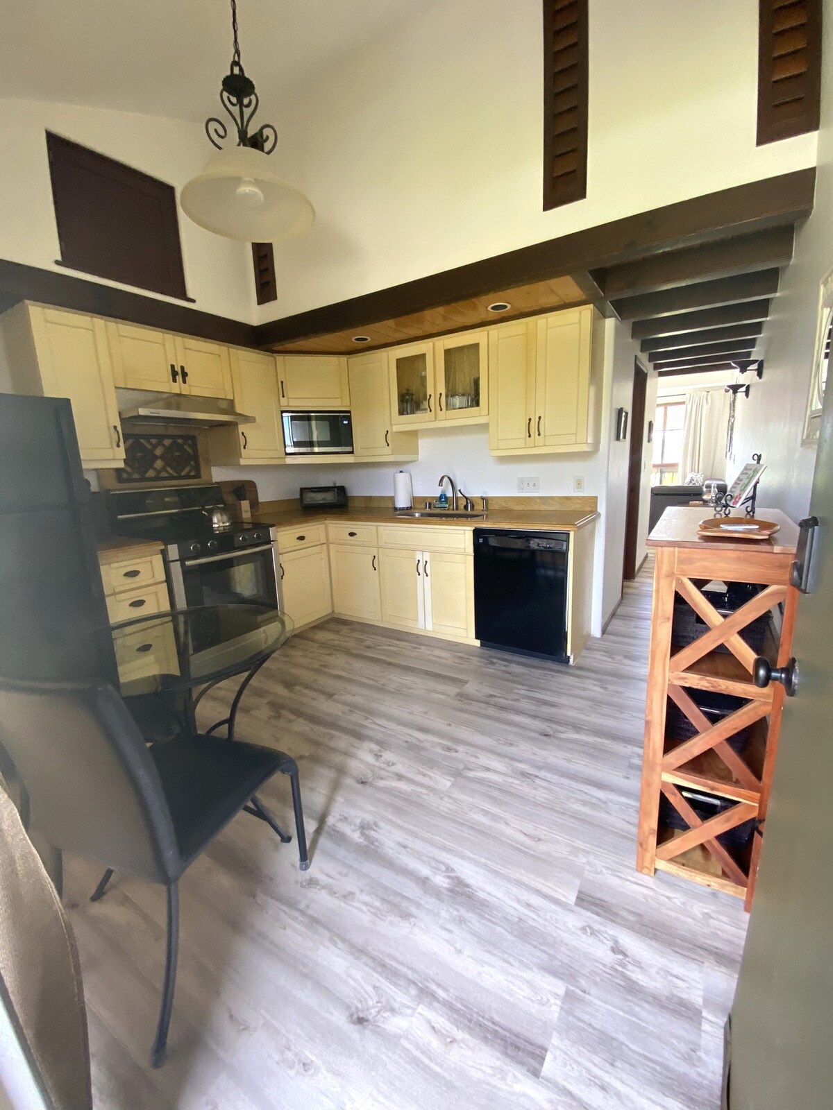 Vår moderne luksusleilighet, som ligger i den fantastiske North Shore, inkluderer et studio/bdrm+ loft (tilgjengelig via trapper) med katedraltak og en overbygd lanai, perfekt for familier eller alle som elsker å lage mat! Leiligheten har en fortryllende utsikt over de frodige fjellene rundt Kauais ikoniske Hanalei Bay. Denne leiligheten vil du få deg til å føle at du gikk rett inn i interiørdesignet ditt drømmebrett! Gjør dette til ditt andre hjem, hvor vi har tenkt på alt for deg!
