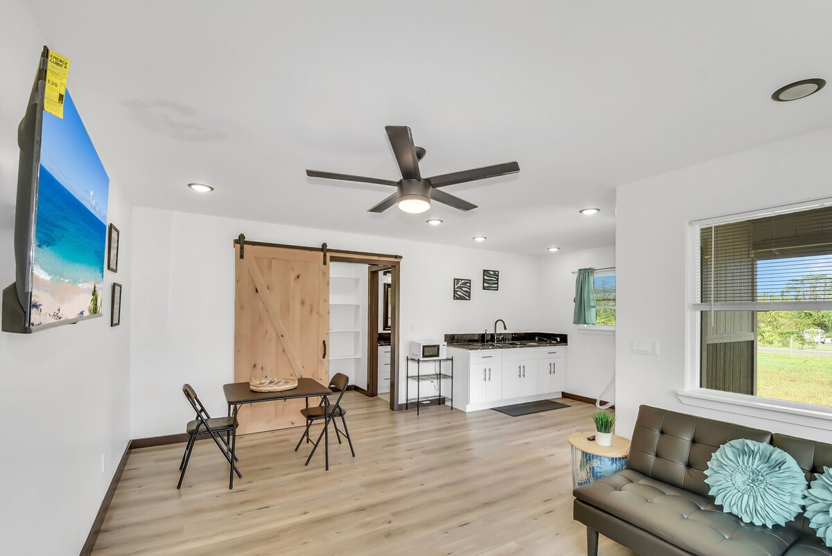 Flykt til den frodige roen på øya Hawai’i med denne koselige studioleiligheten i Kea’au, bare en kort kjøretur fra Hilos strender, butikker og attraksjoner. Denne private studioleiligheten er perfekt for lengre opphold, hjemmekontorarbeidere eller forretningsreisende, og tilbyr en rimelig langtidsutleie omgitt av tropisk grøntområde. Merk: En annen leietaker av ferieboligen vil være til stede i hovedhuset, som ligger på samme eiendom. Studioleiligheten er helt privat med egen inngang, noe som sikrer et fredelig og uavhengig opphold. Denne moderne studioleiligheten, med minst 30 netters opphold, har en komfortabel, åpen planløsning med alt du trenger for et enkelt og fredelig opphold. Inne finner du: Soveplasser: Futonseng og en ekstra oppblåsbar luftmadrass for fleksible sovealternativer. Tekjøkken: Utstyrt med et minikjøleskap, kokeplate med to plater, mikrobølgeovn og basisutstyr for matlaging for å tilberede enkle måltider. Bad: Komplett bad med dusj og alle grunnleggende fasiliteter Komfortfunksjoner: Bærbart klimaanlegg i vinduet, takvifte og vinduer med netting for å slippe inn øybrisen Merk: Det er ingen vaskemaskin eller tørketrommel på stedet. Gjestene har tilgang til flere vaskerier i nærheten, som ligger en kort kjøretur unna. Ingen store sammenkomster. Utvendige overvåkningskameraer på stedet, og dette håndheves strengt. Leietakere på stedet som bruker hovedhuset, kan være til stede. Sted Dette hjemmet ligger i det rolige Puna-distriktet og tilbyr en rolig lokal opplevelse, samtidig som det er i nærheten av: Hilo Town – kun 20 minutter unna for å spise, handle og besøke bondemarkeder Hawai’i Volcanoes National Park – 40 minutter unna for uforglemmelige turer og lavalandskap Kehena Black Sand Beach, Pohoiki Warm Ponds og andre naturskjønne kystskatter Enten du er ute etter et rolig sted å jobbe hjemmefra eller en hjemmebase for å utforske Øst-Hawaii, tilbyr denne studioleiligheten i Kea‘au komfort, privatliv og mye for pengene for lengre opphold.
