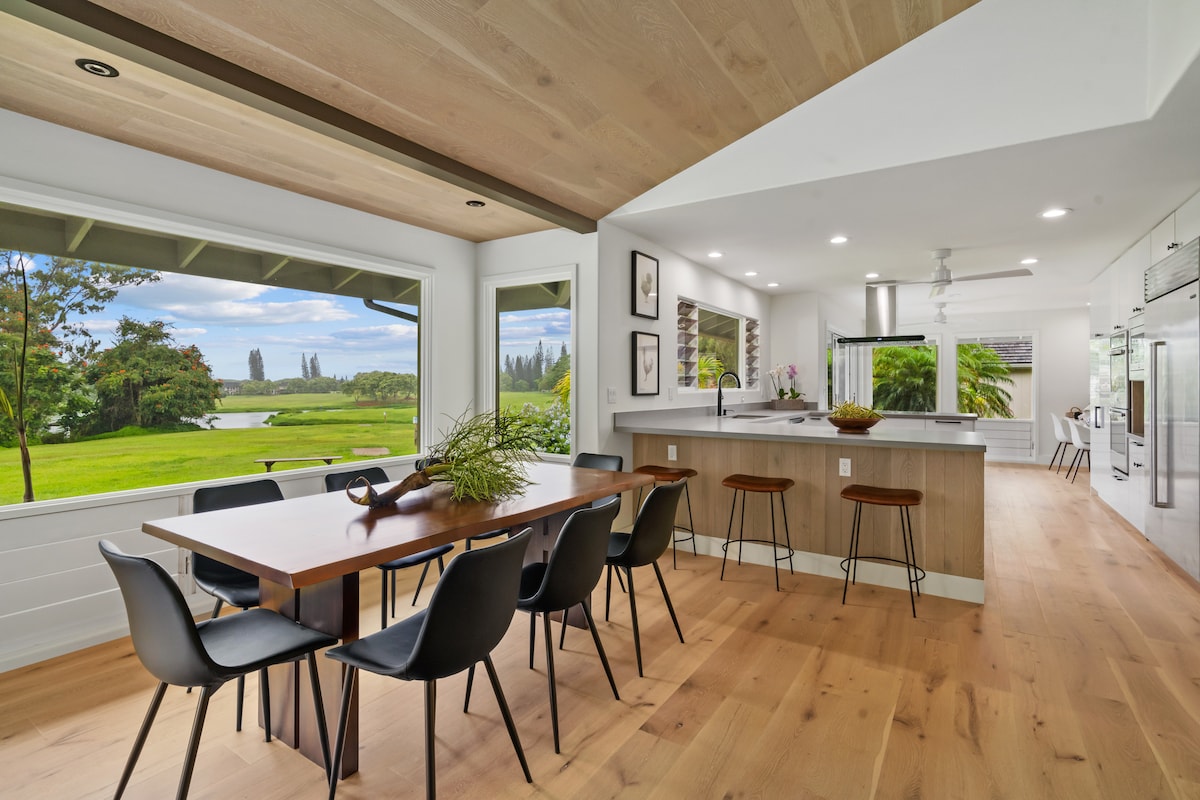 Velkommen til Luana House. Nybygg, boho-modern designet av en lokal arkitekt, romslig hus med fire soverom, fire bad, aircondition på golfbane. Dekket Lanai inkluderer sitteplasser, spisesteder og grill. Fantastisk utsikt over golfbanen, gangavstand til shopping, dagligvarebutikk og stranden. Perfekt for hjemmekontor, vennegjenger og familier. Minutter unna surfing på Hanalei Bay, Queens Bath og Makai golfbane. Fremhevet i Dwellescapes.