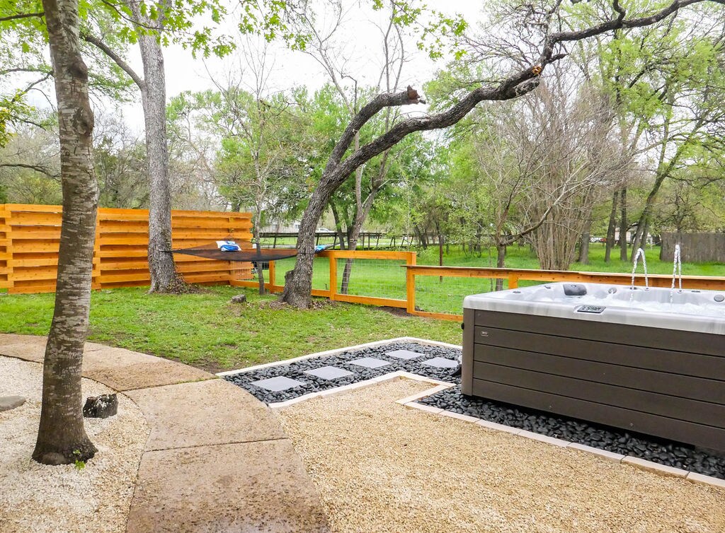 Dette kunstneriske landlige tilfluktsstedet er en blanding av sjarmerende sjarme og moderne eleganse. Kom tettere på en av dine nærmeste, eller bare koble deg fra verden. Se på solnedgangen eller stjernene helt privat fra verandaen eller boblebadet med utsikt over en eng omgitt av trær. Gå inn i en flom av naturlig lys. Lag et måltid på det fullt utstyrte kjøkkenet. Få en god natts søvn i den organiske kingsize-sengen. Utforsk vingårder, bryggerier og turstier i nærheten. Austin ligger også en kort kjøretur unna!