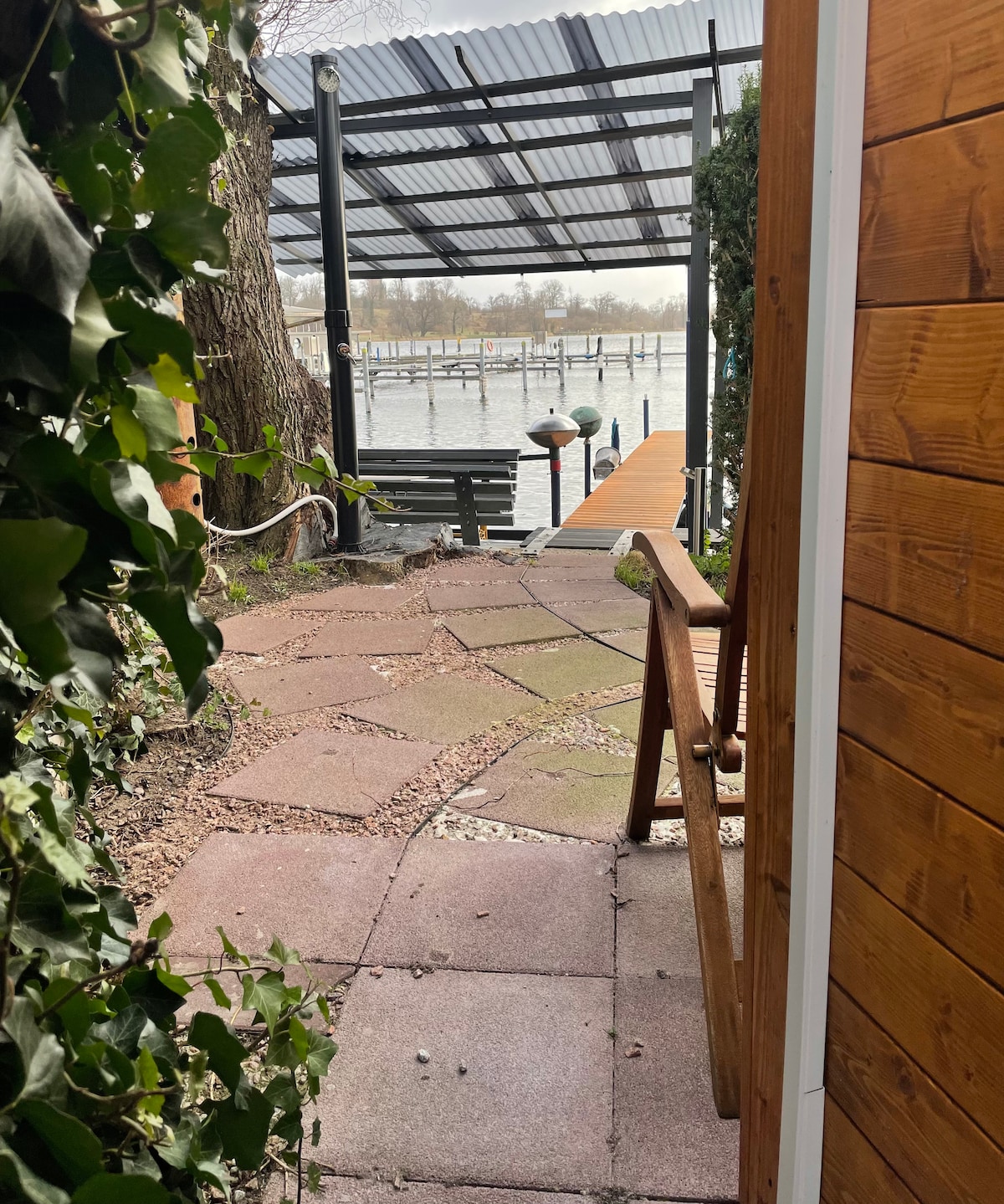 Husbåten vår er en koselig, moderne fast båt, som ligger på en brygge på en campingplass. Utstyret av høy kvalitet og den fantastiske utsikten over Templinsjøen gjør det vanskelig for oss å dra hver gang. Om sommeren nyter vi den 90 kvm store takterrassen, som også inviterer deg til grilling. Gjennom gulvvarme, peis og vår egen sauna, gjør vi husbåten vår til en fantastisk retrett selv om vinteren.