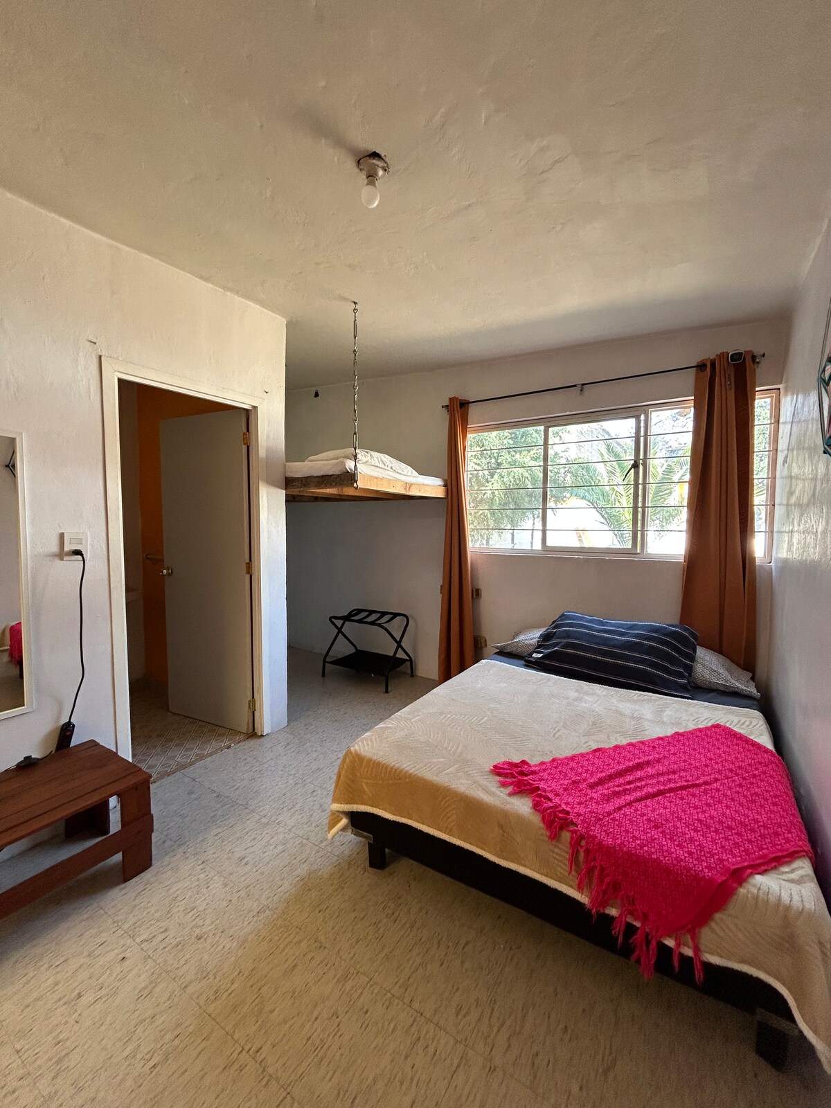 Uavhengig rom med king-size-seng i første etasje, utstyrt med alle fasilitetene for enkelhets skyld. Nyt privat bad, internett, kjøkkenkrok, kjøleskap og smart-TV. Vi har parkering rett utenfor soveromsdøren og rikelig med hager for å slappe av. Vi ligger bare fem minutters gange fra Jilotepec sentrum. Atmosfæren er rolig, i et trygt og rolig område, ideelt for et hyggelig og avslappet opphold.