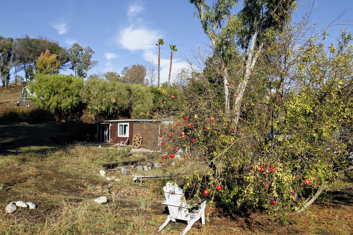 Hytta ligger ved frukthagen vår, med svært privat utsikt fra hvert vindu. Komfortabelt møblert (queensize-seng, sofa, skrivebord, garderobeskap, kommode,TV), kjøkken (inkludert w/d), bad (dusj) og en gjerdet hage for å slappe av. Den har en lett og luftig følelse, oppvarming og a/c. Komfortabel å komme seg til jobb eller helbrede eller utforske SoCals strender, fjell, fotturer, sykling, besøk Universal Studios eller Santa Barbara et perfekt lite hjem å komme seg vekk i noen dager, uker eller måneder.