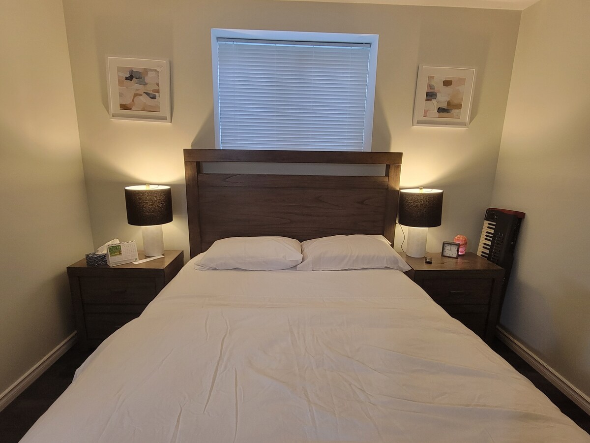 Nyt privat separat inngang til denne rene og velutstyrte suiten på et soverom på et soverom. Utstyrt kjøkken, vaskerom i suiten, privat parkering og uteplass. Ideell for lengre opphold, perfekt for ett eller et par. → Fullt utstyrt kjøkken med oppvaskmaskin, komfyr, mikrobølgeovn osv. → Koselig soverom med Serta queen-madrass → Gasspeis, åpen stue, TV. → Arbeidsplass + trådløst nettverk. → Romslig bad med fire stk. → Vaskeri → Parkering utenfor gaten Juridisk sekundær suite har dedikert varme/ventilasjon.
