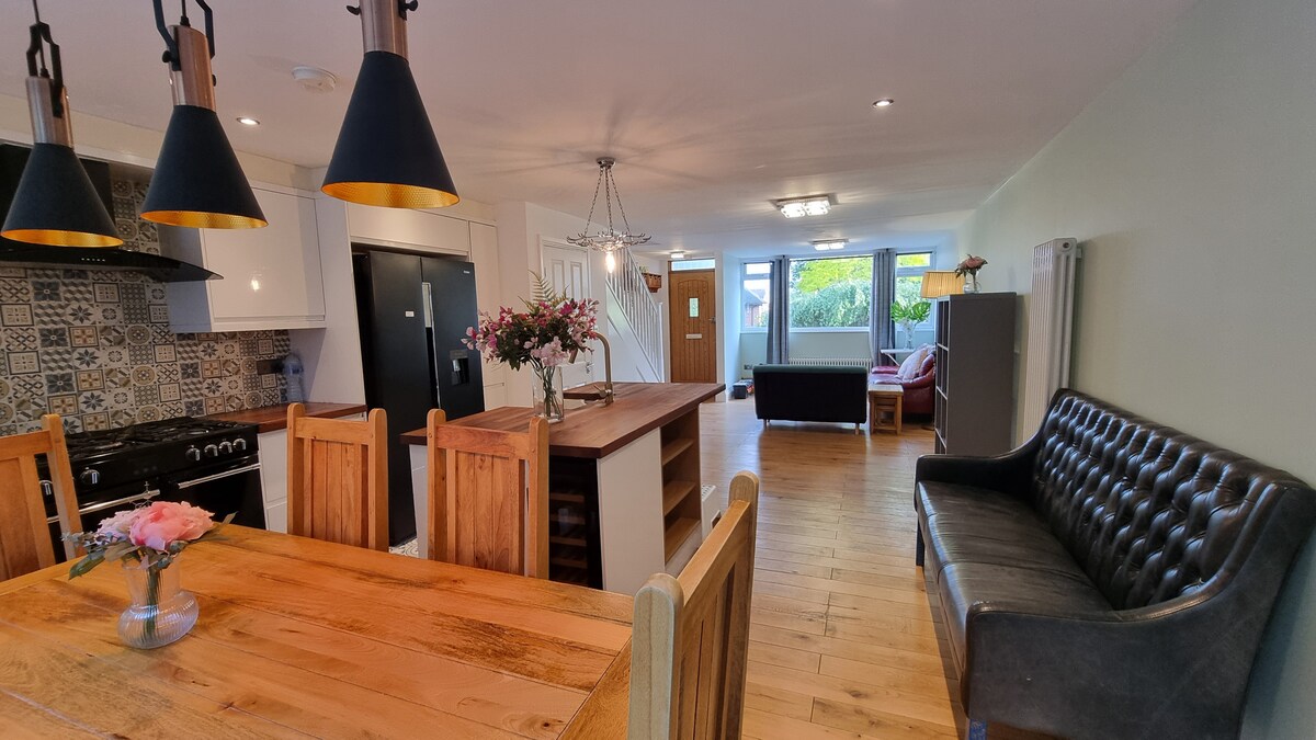 Spacious Family & Group Villa Unwind in a spacious villa that perfectly blends comfort and convenience. Ideal for families or groups, it features a private garden for serene outdoor moments right at your doorstep. Bedrooms Four well-appointed bedrooms accommodating up to 8 guests: Three bedrooms with king-size beds. Fourth bedroom with a king-size bed and single bed, offering flexible sleeping arrangements. Designed for restful nights and comfort for all guests. Bathrooms Two bathrooms for convenience and privacy: Shared bathroom (first floor): Bath and walk-in shower. Ensuite bathroom: Walk-in shower. Ensures ample space for everyone. Kitchen Fully equipped kitchen with modern appliances: Fridge, oven, hob, microwave, dishwasher. Ideal for home-cooked meals and easy cleanup. Living Area Spacious lounge perfect for relaxing or socialising. Reliable internet access for staying connected or working remotely. Amenities Fresh linens and towels provided. Onsite washing machine for added convenience. Designed for a comfortable, stress-free stay. Parking Free parking on the premises for easy and secure access. Local Amenities & Attractions Local shops and caf s: 5 min drive. Museums: 10 min drive. Countryside trails: 15 min drive. A perfect base to explore, relax, and enjoy the surrounding area. Your Peaceful Escape Nestle into this villa as your gateway to rest, relaxation, and adventure, combining comfort at home with the beauty of the surrounding landscape.