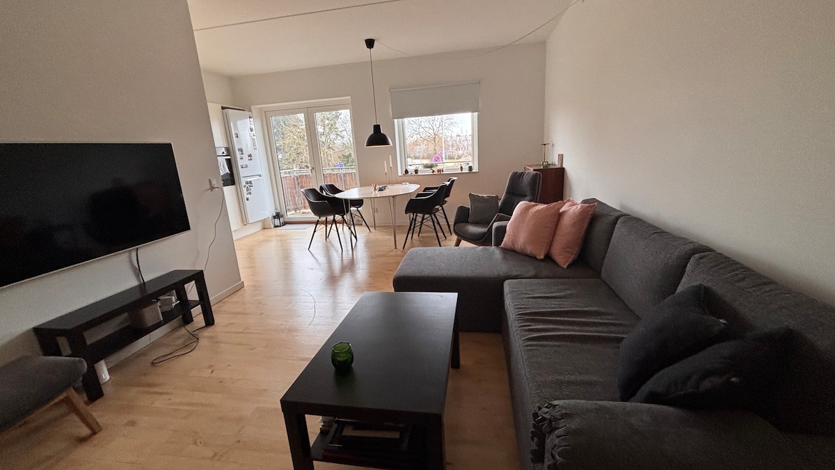 Velkommen til den lyse treromsleiligheten min med to separate soverom. Leiligheten ligger sentralt og består av en stor stue, et soverom med en kingsize-seng, et kombinert kontor/gjesterom med en enkeltseng og et kjøkken med spiseplass og oppvaskmaskin. Det er kun: • 100 meter til buss. • 200 meter til shopping og restauranter. • 400 meter til Frederiksborg slott • 900 meter til togstasjonen. Nyt kaffen på den trivelige balkongen med uhindret utsikt mot horisonten. Privat parkering er tilgjengelig rett foran eiendommen.