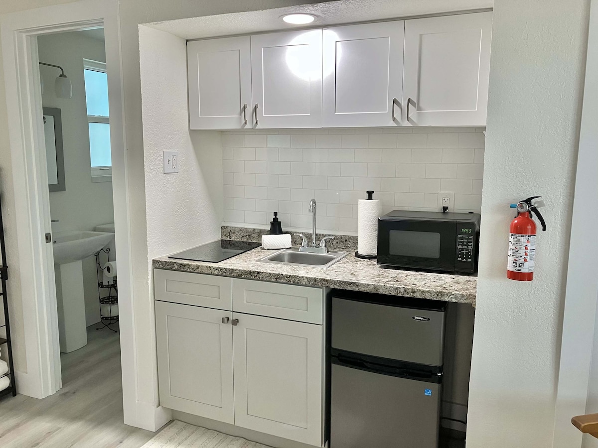 Slapp av i dette førsteetasjeområdet, bare fem minutters gange til stranden. Dette sjarmerende studioet er perfekt for en enkelt reisende eller et par. Tilbered snacks og måltider i kjøkkenkroken eller grill lokal sjømat på uteplassen. Nyt utsikt over vannet og delfinene fra bryggen vår ved bukten vår. Denne enheten har tilgang til det nybygde bassenget som ligger mellom 617 og 611 Bay Esplanade-bygningene. Det er vaskemaskin og tørketrommel ved siden av.