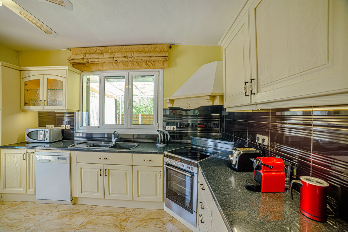 Stor familiehytte med fem soverom. Det er den perfekte familieferien med privat minigolfbane, oppvarmet basseng, et utendørs treningssenter, en gårdsplass med et stort kroket-/billiardspill, et inngjerdet lekeområde for små barn og god plass til å løpe rundt. Det oppvarmede bassenget kan inngjerdes når som helst, og innendørstrappene er utstyrt med sikkerhetsporter. Villaen ligger 150 meter fra sandstranden Roda, som har ekstremt grunt vann de første 25 meterne, noe som gjør den ideell for barn å leke på.