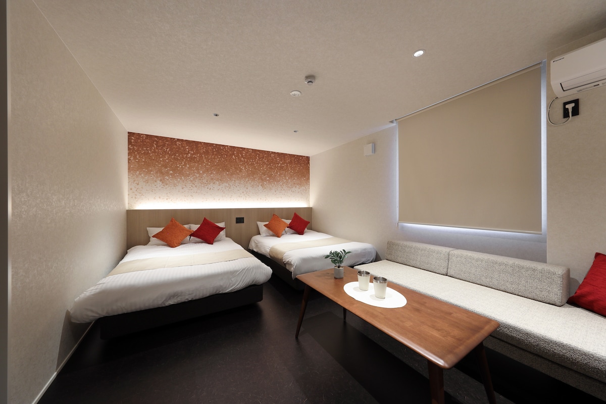 【MOMIJI TERRACE Hiroshima】 四季を巡る特別なステイ 広島市南区的場町に、日本の美しい四季をテーマにしたコンセプトルームが誕生しました。 301号室は「秋」をテーマにしたお部屋です。お部屋ごとに異なる季節の彩りをご用意。訪れるたびに新しい発見がある、デザイン性の高い空間です。 ファミリー・グループにおすすめ 最大5名様までご宿泊いただけます。 ダブルベッド 2台・ソファベッド 1台 バスルームとトイレが分かれた「風呂トイレ別」のセパレートタイプです。自宅のように快適にお過ごしいただけます。