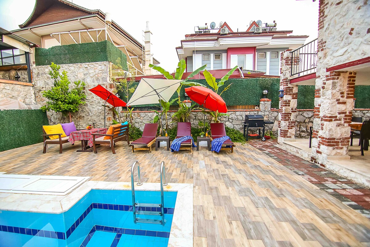 Dette huset ligger i Fethiye Ölüdeniz, som vil fascinere deg med sin fantastiske fjellutsikt og natur. Det ligger fire km fra den verdensberømte Ölüdeniz-stranden og ti minutters gange til underholdningsområdet Hisaronu. Huset har tre soverom, og hvert har sitt eget bad. Det er boblebad og treningssenter i toppleiligheten. Vi har ett basseng på åtte meter i den romslige hagen vår. Det er også et grillområde og en trampoline for barn. Huset har ubegrenset internettilgang.