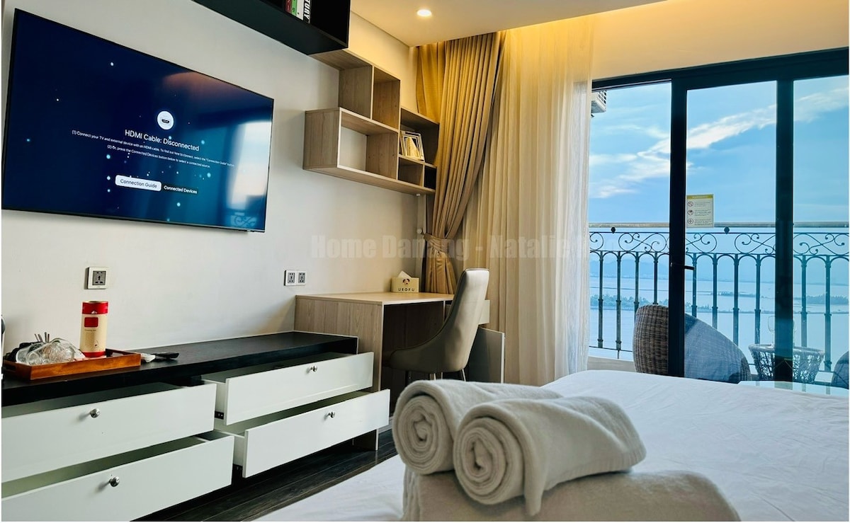 Denne romslige leiligheten på 110 kvm har utsikt over Han-elven og Da Nangs ikoniske broer, og den tilbyr et fredelig tilfluktssted over byen. Beliggende på den livlige gaten Bạch Đằng, rett overfor elven og bare en kort spasertur fra Han-markedet, kan gjestene nyte Dragon Bridges brannshow kl. 21.00 i helgene fra sin egen balkong. Hjemmet er designet i dype marineblå toner med varm trefinish, og det føles rolig og raffinert. Daglig rengjøring, gratis basseng, treningssenter og bordtennis gjør det ideelt for familier, forretningsreisende og lange opphold.