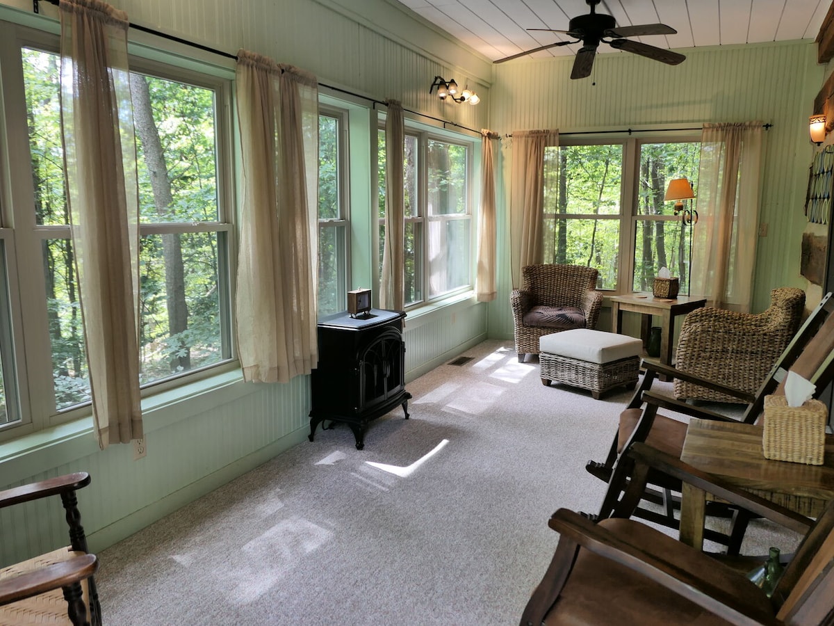 This 1840s log cabin is ideal for a family of four or a cozy couple’s retreat. Tucked into a wooded hillside, Pine Grove Cabin offers a true home-away-from-home feel. Enjoy forest views from the four-seasons enclosed porch, cook in the fully equipped kitchen, and relax on the deck with seating and a propane grill. The cabin features two upstairs bedrooms with queen beds, a full bathroom with a tiled shower on the main floor, and a living room with a Smart TV for added comfort and entertainment.