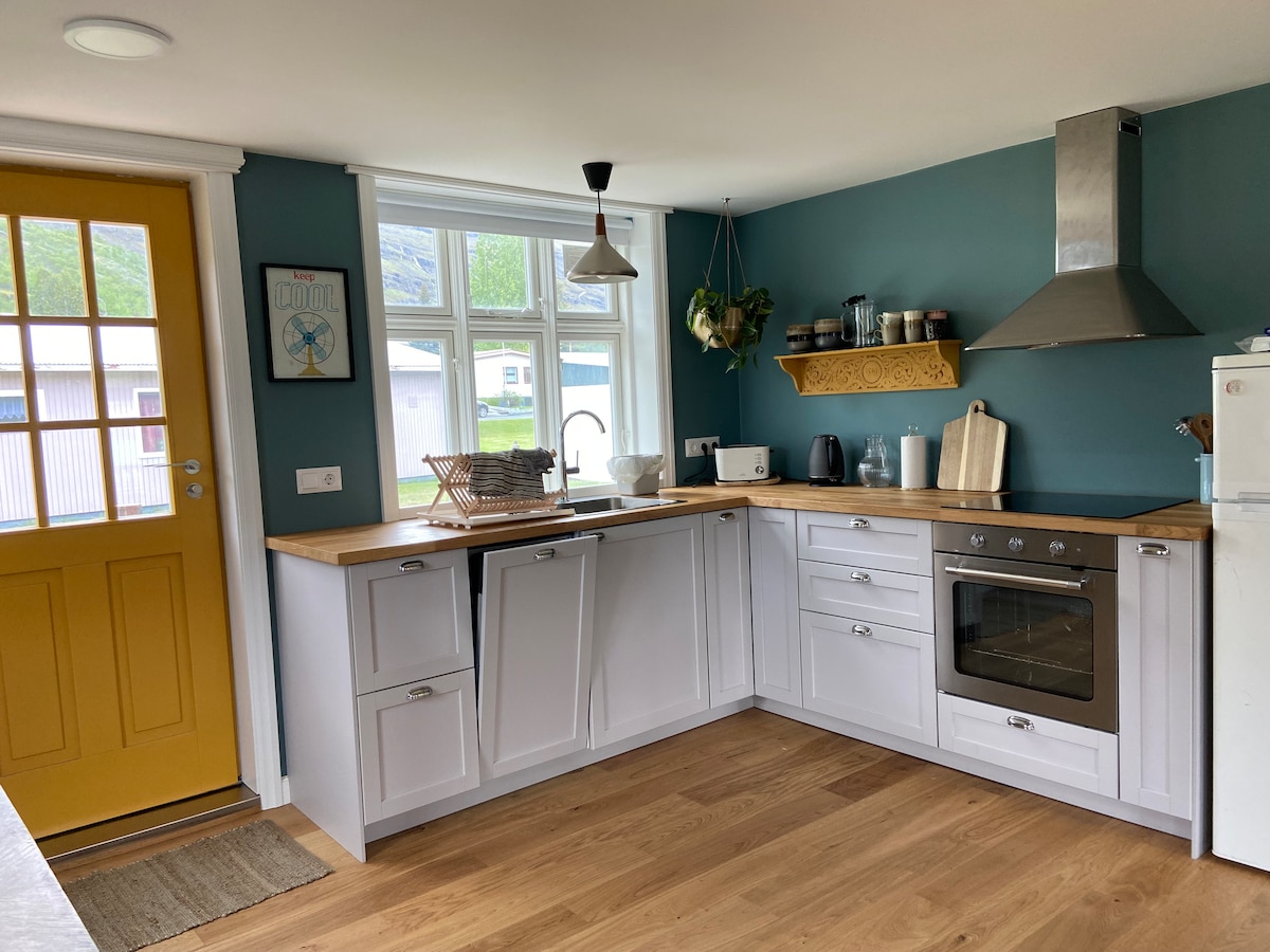 Slapp av med hele familien i dette fredelige huset i nærheten av Höfn. Drikk kaffe i den magiske hagen eller nyt en god middag på solrommet. Dette vakre, hjemlige huset er et fristed mens du nyter underverkene i Hornafjörður. Vi kaller det Fagranes eller Beauty Point, og hagen er en ekte skjønnhet. Vi oppfordrer gjestene våre til å utforske hagen, lukte på blomstene og finne bærene når det er sesong. Hagen er vakker i alle årstider. Huset vårt er perfekt for familier.