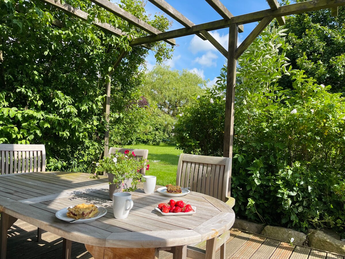 Vårt vakre offisielle hus er den tidligere boligen til hertugen av Oldenburg og ligger på baksiden av eiendommen vår, omgitt av grøntområder med utsikt over marker og enger. Rommene er romslige og smakfullt designet, og selv med mange mennesker kan du alltid finne ditt eget tilfluktssted for å puste. En stor, privat hage med terrasse og hagemøbler venter på deg, ved siden av er hesteengene våre.