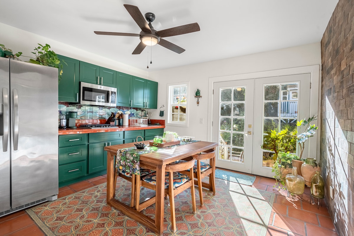 Dette avsidesliggende Casita (gjestehuset), bygget i 2006, ligger i hagen bak Irving Gills Morgan House (ca. 1917). For arkitekturinteresserte eller de som ønsker å oppleve en litt roligere side av LA, er dette noe for deg. Sentralt beliggende i Hancock Park nær Paramount Studios og Larchmont Village og en kort kjøretur til Hollywood og The Grove. Casitaen har ett soverom med en queensize-seng, et bad med privat utendørs dusj og varmelampe, og en separat stue med kjøkkenkrok. Franske dører på soverommet åpner seg mot en rolig hage som inkluderer en koi-dam, gassbålpanne, utendørs spiseplass (med varmelampe og lydanlegg) og en grill. Hagen deles med eieren som bor i hovedhuset. Perfekt for en newyorker som spiser mye ute. Kjøkkenområdet har kjøleskap, mikrobølgeovn, kaffetrakter, gryte, kaffetrakter og brødrister. Når det gjelder teknologi, har Casita Apple TV, så hvis du har en konto, kan du logge på og se alt du vil hjemme. Den har også en DVD-spiller og en omfattende samling av filmer. Vaskemaskin og tørketrommel med enkel tilgang er tilgjengelig i hovedhuset. Inngjerdet parkering utenfor gaten er inkludert. En Pavilions-dagligvarebutikk ligger et kvartal unna. Larchmont Village – tenk på Main Street i en liten by – ligger bare en kort spasertur unna. Utmerket, butikkshopping inkluderer en førsteklasses vin- og ostebutikk, håndverksmessig kaffe, yoga, bakerier, den beste skjønnhetsbutikken i LA og et fantastisk søndagsmarked. Fantastiske spisesteder innenfor en radius på to kvartaler omfatter Tonchin LA, Tu Madre, Gratitude Cafe, Osteria Mamma, Great White og Ramen Melrose.