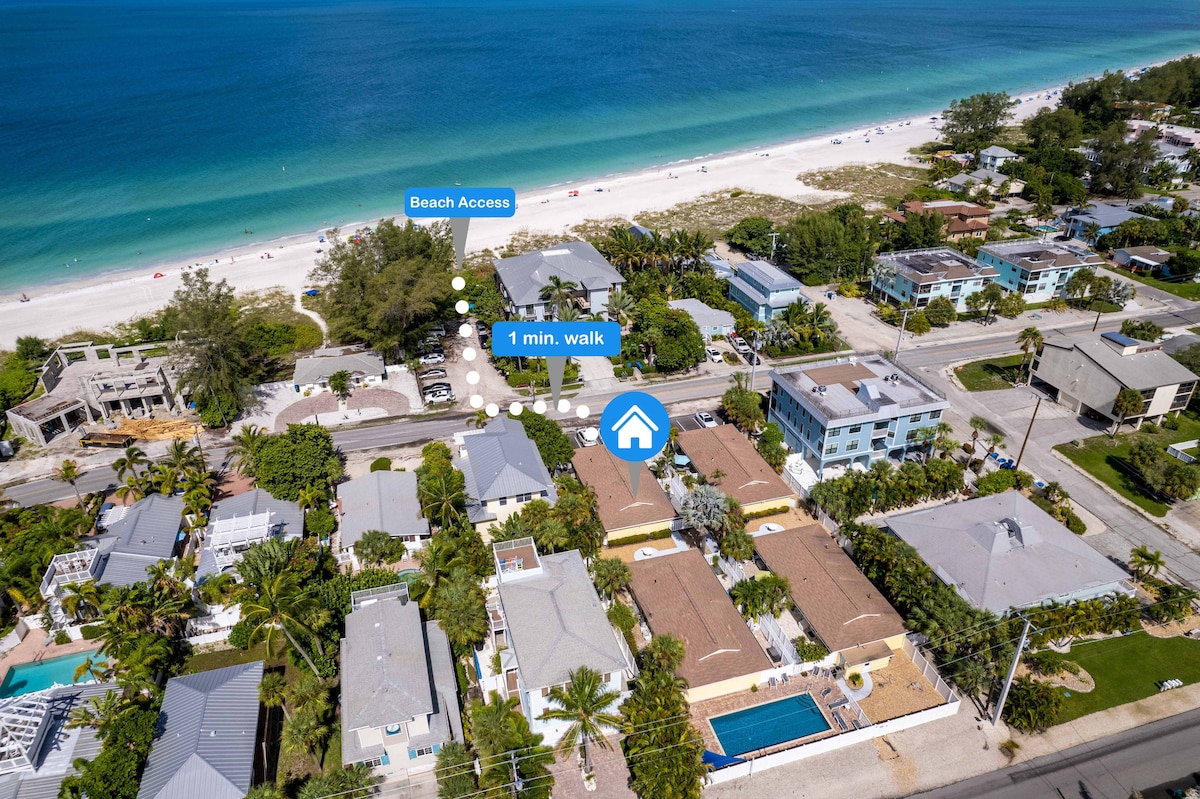Back Open Jan '25! Located just 200 steps from the beach you’ll have your feet in the sand in no time. A comfortable living area + fully equipped kitchen. Furnished with island décor and local art. Everything you need including a heated pool, large patio with a Tiki hut, tropical gardens, plus a private outdoor area with a shower for your comfort. Walk to everything – grocery, pharmacy, ice cream, breakfast, pizza, donuts, and the beach which is less than 2 minutes away.