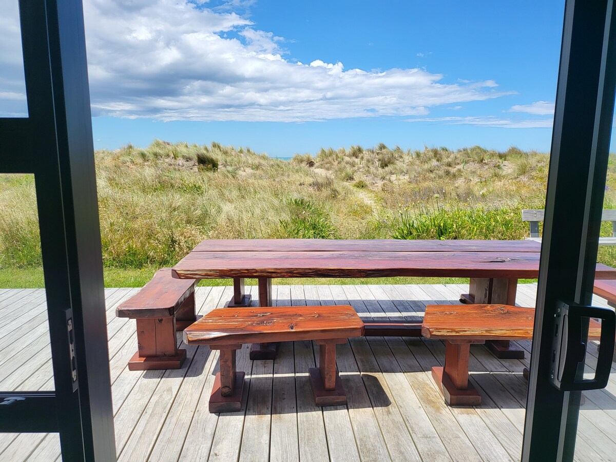 Beliggenhet, beliggenhet, beliggenhet! Denne hytta fra 70-tallet ligger midt i sanddynene, med nydelig utsikt fra øverste etasje. Første inngang er via inngangsdøren, og heisen tar deg til andre etasje. (Det er ingen innvendige trapper.) Dette er en original NZ-bach, og du må ta med dine egne sengetøy og håndklær. Takk. (Jeg kan levere hvis du reiser.) Det er tre soverom, to dobbeltsenger oppe og en queensize-seng, og to barnesenger nede.