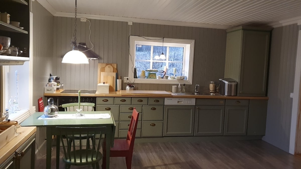 Ferdig oppreide senger og gratis sluttrengjøring. 96 m2 stort hus med stor terrasse, grill og nydelig utsikt. Terrassemøbler. 3 soverom. Fantastiske solforhold. Ligger på gård i drift med melkeproduksjon. Parkering rett utenfor dør. Rullestolrampe, alt på et plan. Muligheter for å se både nordlys, elg og rådyr fra terrassen. Smart-Tv og internett inkl.,Sprinkelseng og stellebord. Nært skog, turmuligheter og skiløyper. Laksefiske og småviltjakt i nærheten. Egen ladekabel bil må medbringes.