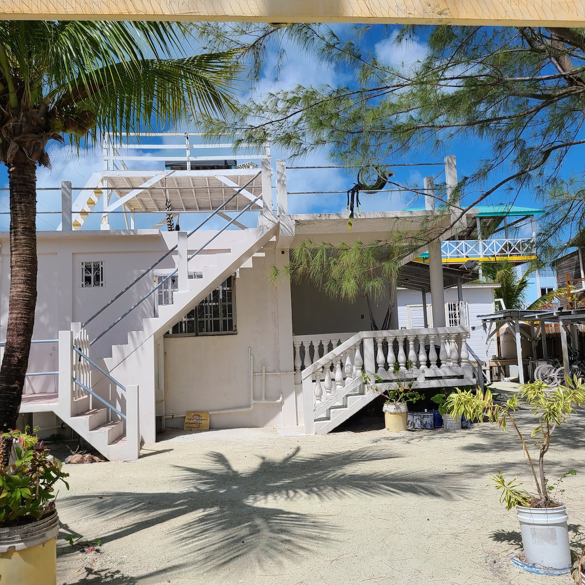 Et fredelig minihus laget for bare to. Hjemmet mitt ligger på sørenden av øya, og det er et supermarked rett overfor hjemmet som er perfekt for å kjøpe drikke og mat. Det er et par restauranter innen 15 minutters gange fra hjemmet. Hjemmet ligger ca. 15–20 minutters gange til sentrum, eller jeg kan ordne en taxi til å ta deg dit. Det er en 1,5 miles spasertur, så vær forberedt på å gå. Det er trygt å gå. Jeg bygde dette for når jeg ønsker å komme vekk fra Belize City, så nyt det!