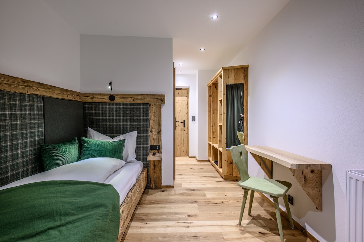 I kategorien Junior Suite med utsikt over fjellene kan du forvente en leilighet på over 30 m² for opptil tre personer med kingsize dobbeltseng og en kvalitets enkeltsengesofa. Leiligheten har et fullt utstyrt kjøkken med en koselig sitteplass, et luksuriøst bad med stor dusj og vaskemaskin, samt en 10 m² stor terrasse med tilstrekkelig sitteplass for en solid frokost utendørs med en fantastisk utsikt over de tyrolske fjellene.