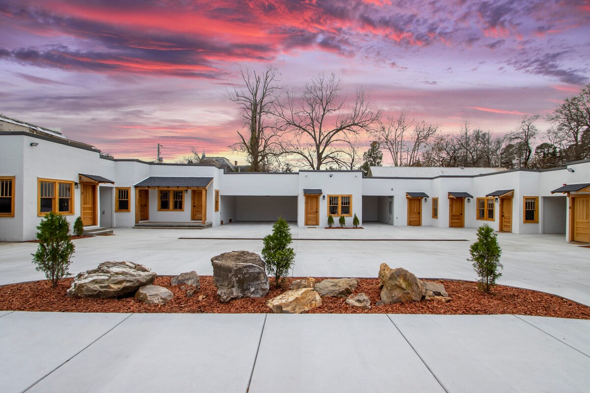 This gorgeous building sits in the heart of historic downtown Hot Springs. Its prime location, slice of history (on the National Register of Historic Places), & elevated style make it the perfect getaway! Walk to Bathhouses, Trails, Restaurants! KEY FEATURES: ☀ King-sized bed w/ high end Centium Satin linens ☀ Kitchenette w/ specialty coffee & cocktail equipment ☀ Shared front and back patio’s w/ fire pits ☀ 55” Roku TV w/ Hulu + Live subscription ☀ Fiber internet