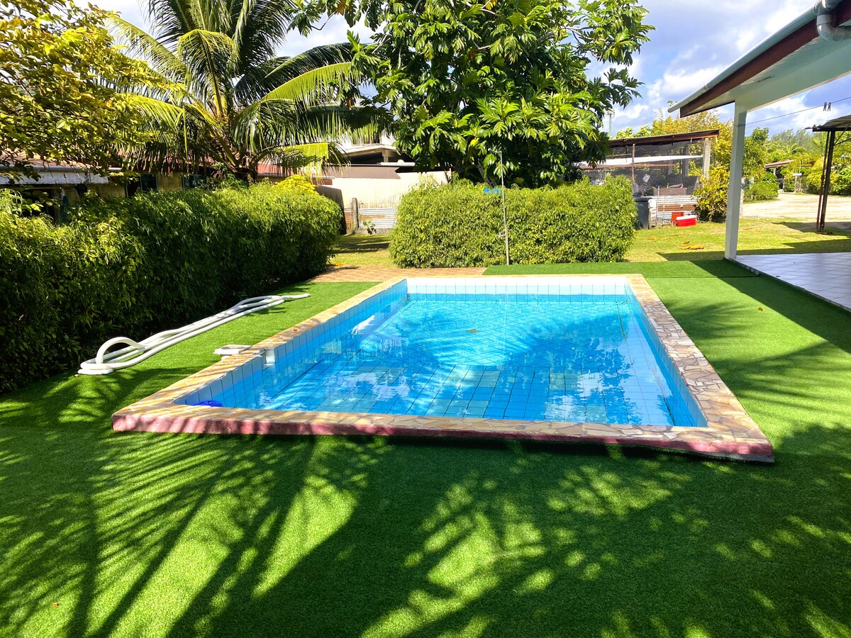 HUSET TEVAIPUNA Hus på stylter i en stor, inngjerdet hage, garasje til én bil, svært stor og romslig terrasse – to soverom med klimaanlegg, utstyrt kjøkken, trådløst nettverk, tilkoblet TV, nær alle fasiliteter, vaskemaskin tilgjengelig, fire strandsykkel (ganske god stand). Plassert i et rolig område, 15 minutters gange fra Fare Quay, 2 km fra flyplassen. Den lille stranden ligger ti minutter unna, og destilleriet ligger fem minutter unna med sykkel.