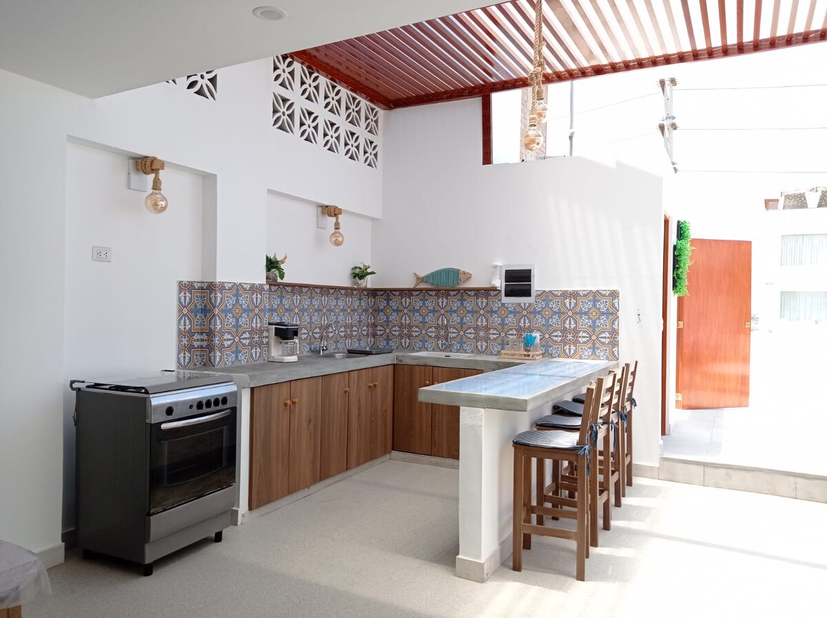 Slapp av med spektakulær havutsikt, basseng og sikker parkering i selveierleiligheten. Tilgang til havet, nær de beste bølgene i sør som Peñascal, Huayco, Santa Rosa, Los Muelles de San Bartolo. Fullt kjøkken, mikrobølgeovn, kjøleskap, kaffetrakter, vannkoker, varmt vann, trådløst nettverk, en komfortabel futon eller sovesofa, en oppblåsbar madrass og kikkert for landskap. LES HUSREGLENE.