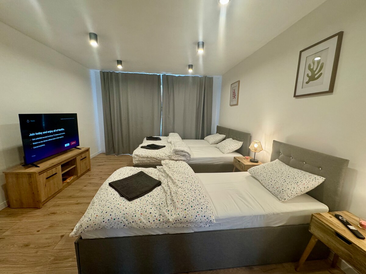 Fullt utstyrt studio, i gangavstand fra sentrum. I nærheten av alle samfunnsfasiliteter. Kjøkkenet tilbyr alle fasilitetene du trenger for å tilberede lunsj eller middag. Nøkkelutveksling og henting er ingen kontakt – basert på inngangskode, full diskresjon gitt :)