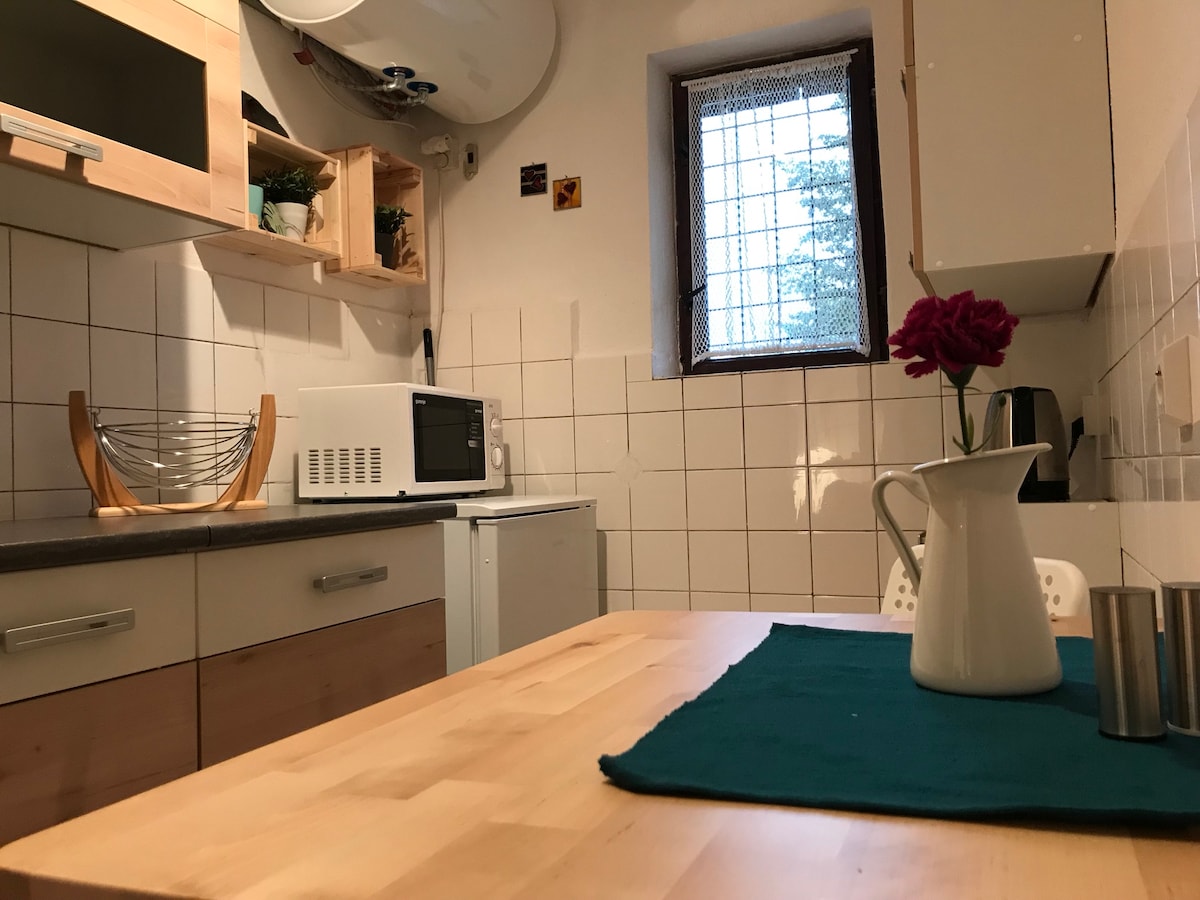 Leilighet hvor historien møter det 21. århundre. Omtrent 80 år gammelt hus gjenoppbygd for moderne livsstil med bevart original vegg laget av steiner. Beliggenheten tilbyr to innsjøer i nærheten, ruiner av slott og vakre turstier. Vinproduksjon i bygda har en tradisjon på mer enn 200 år. Etter avtale med verten kan du bli enige om vinkjellerutflukt med vinsmaking.
