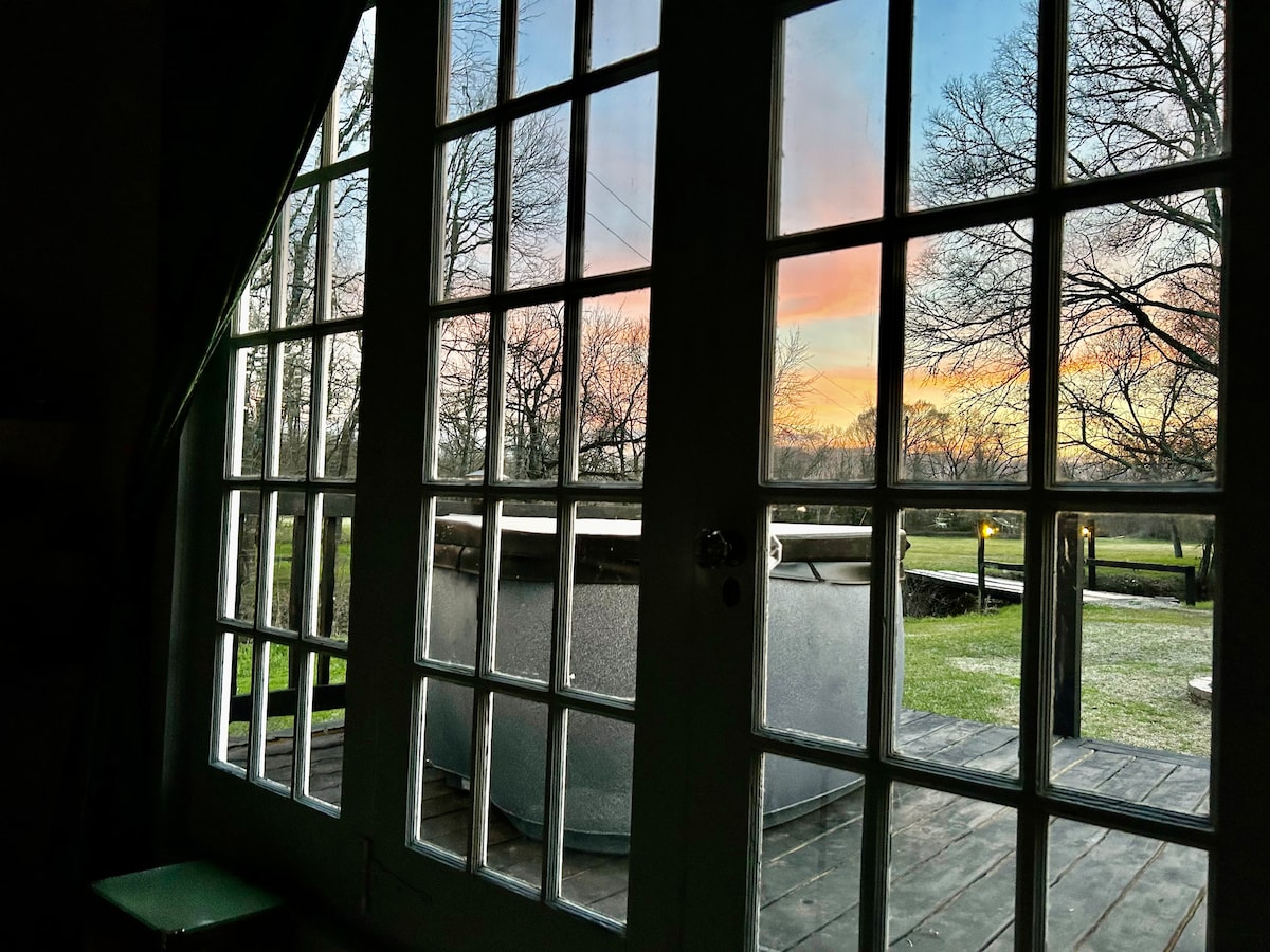 Slapp av og lad opp på den avsidesliggende eiendommen vår på 8 hektar. Denne moderne og luksuriøse jurten har kingsize-seng, spadusj og separat toalett, klimaanlegg, 5G, Roku-TV, kjøleskap, tekjøkken med kaffe, te, krydder og smores! Nyt naturen med en stor terrasse med utsikt over dammen/beitemarken, med boblebad, utedusj, Blackstone-grill og bålbord. Bernhardt Winery ligger 1,6 km unna, og Ren Fest ligger mindre enn 16 km unna. Gjesten kan bruke beitemarken/skogen med turstier, bålpanne og kajakk.