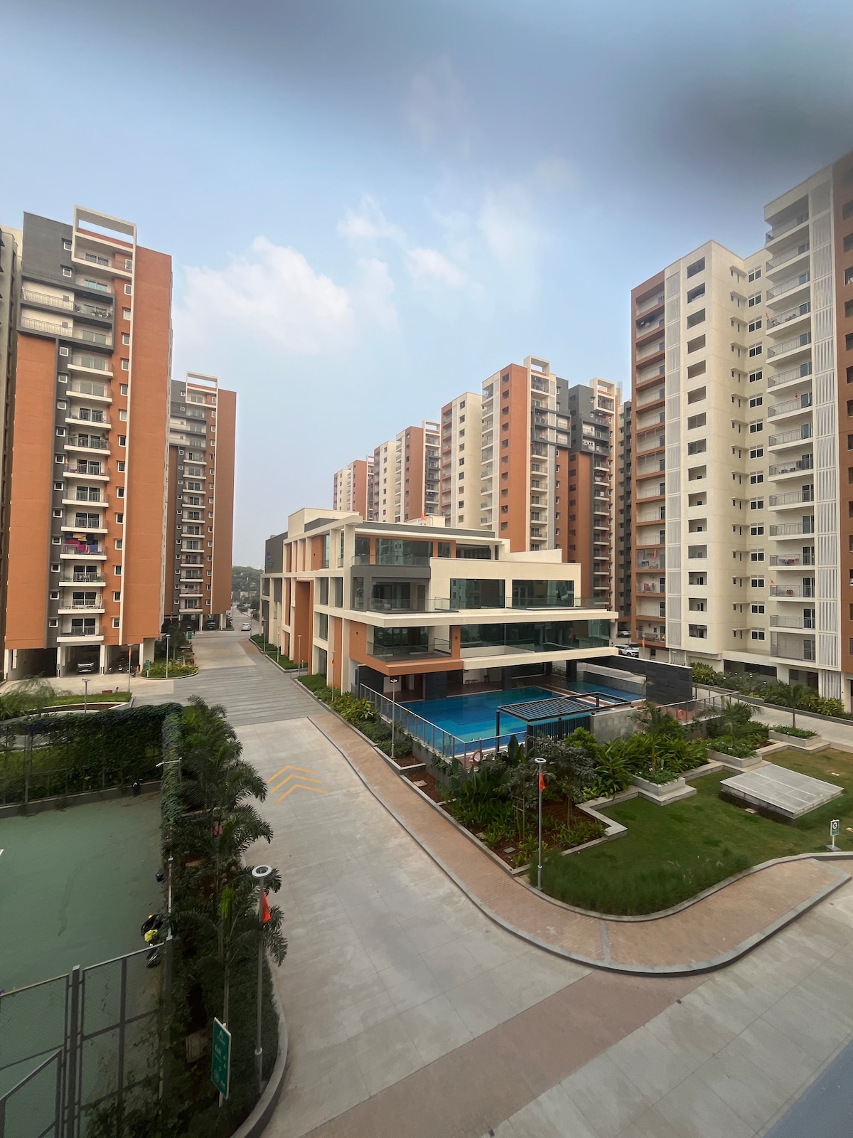 Velkommen til din rolige flukt på himmelen, en elegant høyhusleilighet som ligger i et av Hyderabads mest ettertraktede inngjerdede lokalsamfunn. Denne stilige leiligheten ligger i det pulserende Financial District, og tilbyr den perfekte blandingen av moderne komfort, fantastisk utsikt og uslåelig bekvemmelighet som er ideelt for forretningsreisende, par, digitale nomader og familier. Panoramautsikt, elegant interiør Våkn opp til en feiende utsikt over Hyderabads skyline og frodige omgivelser fra sengen din.