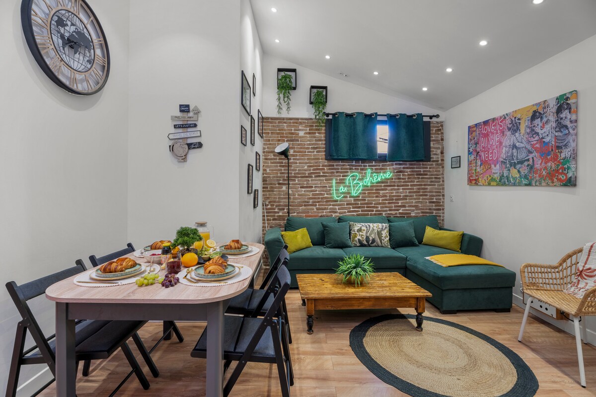 La Bohemia ønsker deg velkommen til en koselig, bohemsk og elegant leilighet. Nyt et fullt utstyrt, moderne kjøkken, en koselig stue med murvegg og planteinnredning og et stilig soverom hvor du kan slappe av. Naturlige materialer, designdetaljer og en lys atmosfære skaper et unikt sted, perfekt for et komfortabelt og sjarmerende opphold