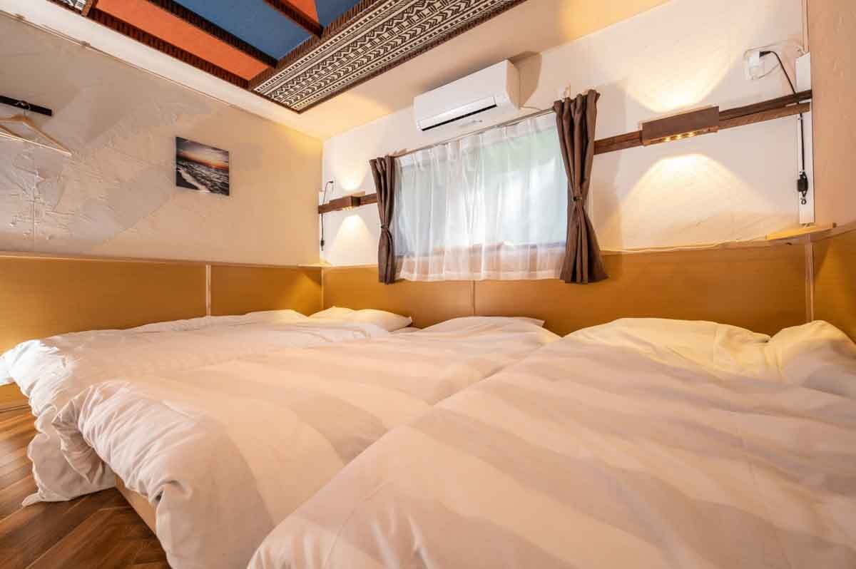 a spacious layout w a large terrace, kitchen, living room, & dining area. The loft bedroom has a double bed & a semi-double bed, while the livingroom also has a semi-double bed. Families can comfortably accommodate children in the loft, while adults can use the living room bed. Surfers will appreciate amenities like the surfboard rack, outdoor shower, & sink. optional BBQ facilities. Enjoy various activities from lively terrace gatherings to movie nights w 100-inch projector.