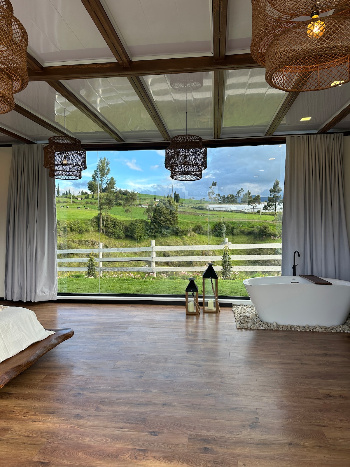 I hjertet av en hviskende skog, blant høye furu- og eukalyptustrær, står en sjarmerende, koselig og lys hytte, med store vinduer som lar deg nyte det gylne lyset fra soloppgangen og unik utsikt over det naturlige miljøet. Ideelt for å slappe av, koble fra og få kontakt med naturen igjen. Perfekt for par eller familier som leter etter fred, fotturer og spesielle øyeblikk i de ecuadorianske Andesfjellene.