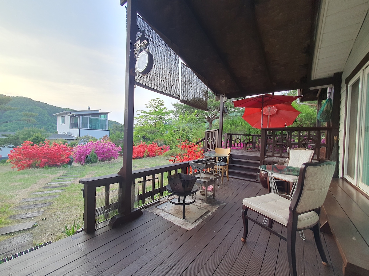 ** Skjult juvel i Mirinae: Mirinae, som ligner en østeuropeisk fjellandsby, en hytte ved innsjøen Det er en liten hytte (sveitsisk hytte) skjult i et lite reservoar i den dype naturen. Dette er et hemmelig sted hvor du kan nyte perfekt fred og privatliv i harmoni med naturen, og det er kun for ett team om dagen. **Spesiell opplevelse:** Når du går ned trappen ved siden av paviljongen foran reservoaret, vil du se verdens roligste Mirine-villa. Kok med ingredienser du har hentet selv i naturens stillhet, og nyt camping, fiske og fotturer. Hyttevillaen er ikke bare et overnattingssted, men en spesiell reise. ** Hyttefunksjoner: ** * 32 pyeong chalet-stil villa * 270 pyeong stor tomt * Pagoda og toetasjes paviljong **Interiør:** * Stue og kjøkken: utsikt over innsjøen og fjellet gjennom store vinduer * Soverom: 2 komfortable soverom * Toalett: 1 * Flerbruksrom: 1 **Utendørsområde:** * Privat grillplass: pagoda, bord, parasoll, huske * Rolig paviljong i andre etasje
