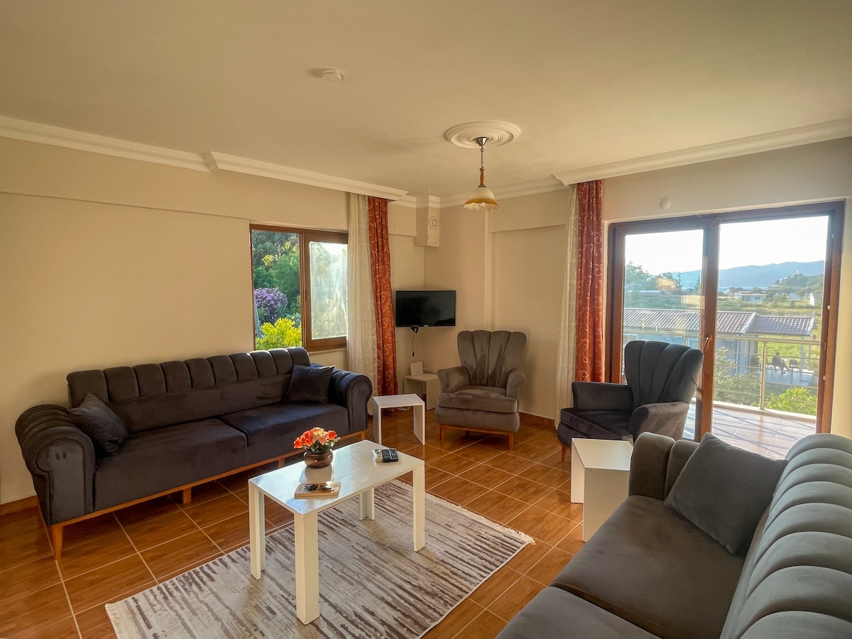 Du kan slappe av som en familie i dette fredelige overnattingsstedet. Våre 1+1-leiligheter er nye og romslige. Inne i leilighetene er det TV, vaskemaskin, klimaanlegg,kjøleskap, kaffetrakter og alle kjøkkenredskaper. Når det gjelder beliggenhet, er det 5_10 minutter med bil til mange bukter og har en veldig stor balkong og hage. Det kan være grill og samovar i hagen vår. Det gir et veldig komfortabelt opphold for barnefamilier. Det gir god fred med utsikt over fjellet. Vi ser frem til en ferie omgitt av uberørt natur