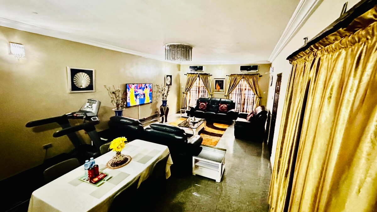 Nyt et minneverdig opphold i den romslige, familievennlige suiten med to soverom, bare fem minutter fra Murtala Muhammed internasjonale lufthavn. Hjemmet vårt er perfekt for familier, grupper eller forretningsreisende, og kombinerer moderne komfort med gjennomtenkte fasiliteter. 🌟 Dette tilbyr vi: • Gratis frokost for opphold på to uker eller mer. • Bilutleie og leie med fleksibel henting og avlevering • Romslig stue med familiesofaer, HD Smart TV og tredemølle. • Gratis parkering på stedet for én bil.