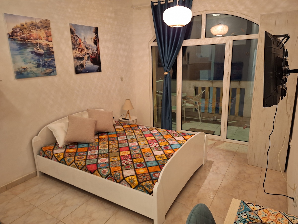Velkommen til Tamaris, en koselig leilighet på strandpromenaden! 🌊 Nyt fantastisk utsikt over bukten gjennom glassveggen i stuen, hvor sofaen enkelt kan gjøres om til en komfortabel seng. Det moderne kjøkkenet er fullt utstyrt for lengre opphold, og det luksuriøse badet med regndusj gir en spa-lignende opplevelse. Renovert i 2022, kombinerer leiligheten stil og komfort. Merk: I juli og august passer den livlige atmosfæren og kveldslarmen perfekt for yngre gjester som liker sommerens puls! 🎉