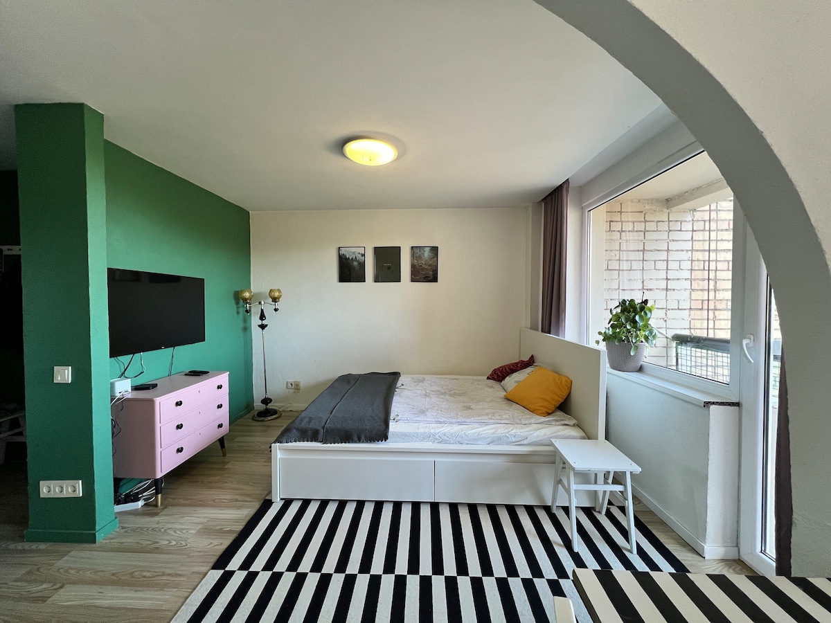 Denne koselige leiligheten med ett soverom i første etasje ligger i sentrum og er perfekt for 2-4 personer. Du kan føle landsbygda her, omgitt av en park, med en skog og innsjø rett over veien. Leiligheten har en solrik balkong og ligger i nærheten av hovedtorget, kjøpesenteret og dagligvarebutikkene. Det er et ideelt sted for både forretningsreiser og ferier. Leiligheten har trådløst nettverk, smart-TV og vaskemaskin.