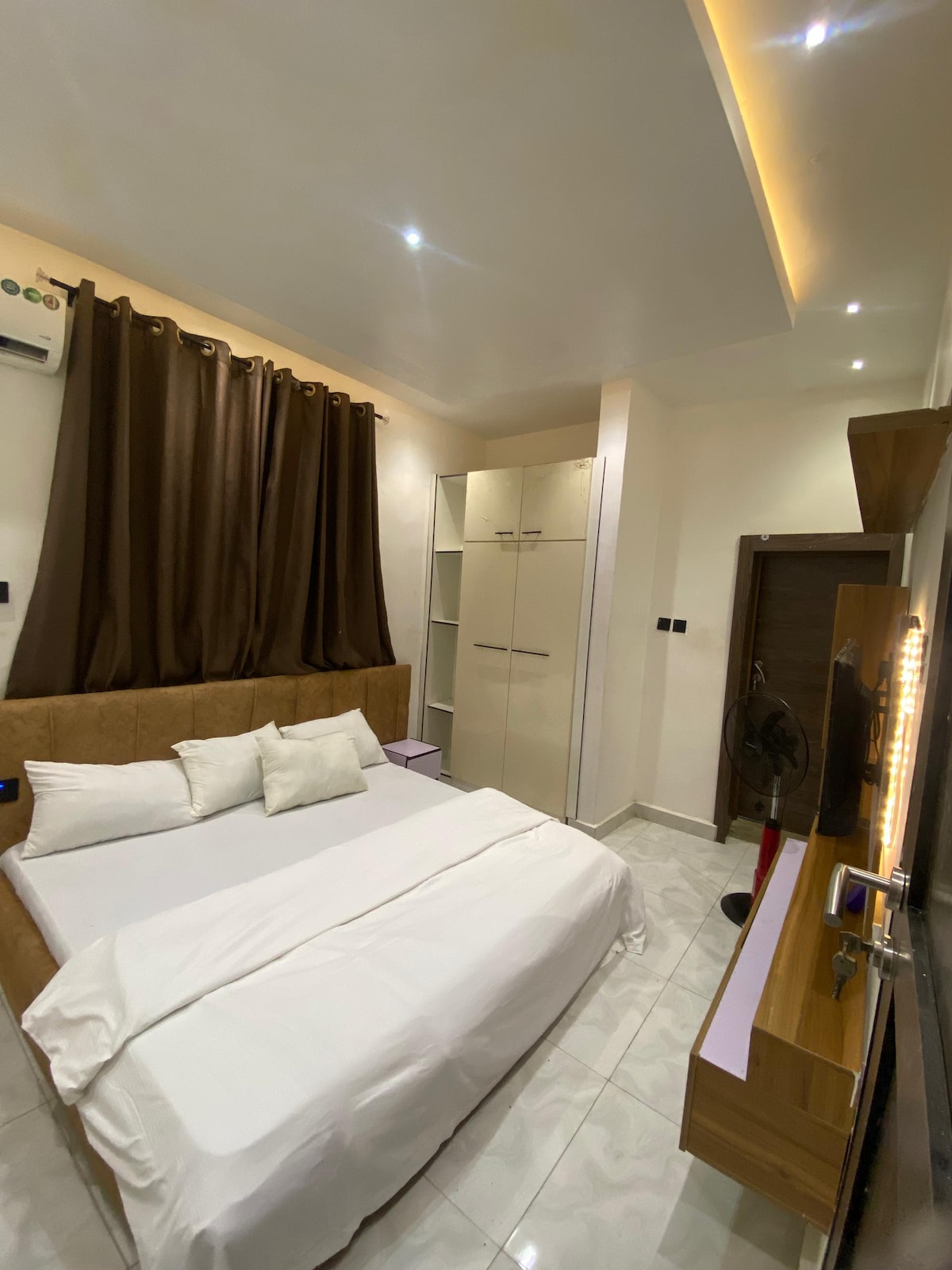 This unique place has its own distinctive style. The standard en-suite room features a semi- orthopedic super king - size comfortable mattress and modern bathroom with water heater. Unlimited super fast 5G Wi-Fi, 43 inches Smart Tv in the room and 55 inches Smart Tv in the sitting room. Netflix, YouTube, DSTV, Smoke alarm, Cctv, 24/7 electricity (Band A) two 50 kva back up generator. Maximum security with security personnel on ground 24/7, 10min to International Airport and Domestic Airports.