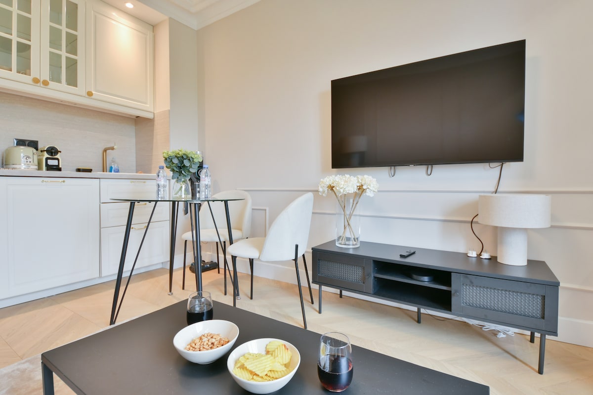 Bo i en stilig ettromsleilighet i en sikker Haussmann-bygning, gangavstand til Eiffeltårnet, Triumfbuen og Champs-Élysées. Leiligheten har en queensize-seng, en koselig stue med en komfortabel sofa, spisebord og fullt utstyrt åpent kjøkken. Raskt trådløst nettverk og Netflix er inkludert. Beliggende i et pulserende nabolag med restauranter, bakerier, kaféer og motebutikker. To T-banelinjer i nærheten gir enkel tilgang hvor som helst i Paris.